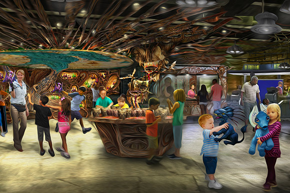 It’s the perfect place to refuel for adventure, surrounded by Na’vi art and cultural items. On an expedition to quench your thirst? Join an expat who came to Pandora and fell in love (and never left) at Pongu Pongu, (translated to “Party Party” in Na’vi). There you’ll find out-of-this-world drinks including a “bioluminescent” frozen cocktail and indigenous beer — spirits sure to buoy yours.
