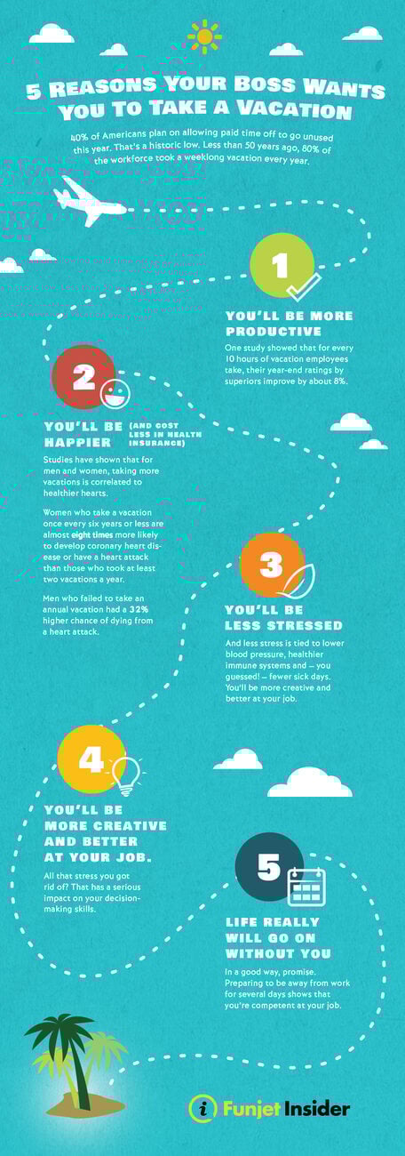 The end of the year is coming up - and that means you probably have a pile of unused paid vacation days left unused. But foregoing a vacation, even a short getaway, has more of an impact on your overall health and job performance than you might think. Studies have shown that taking vacations has a positive influence on your happiness, health and work, which is why your boss really wants you to take a vacation.