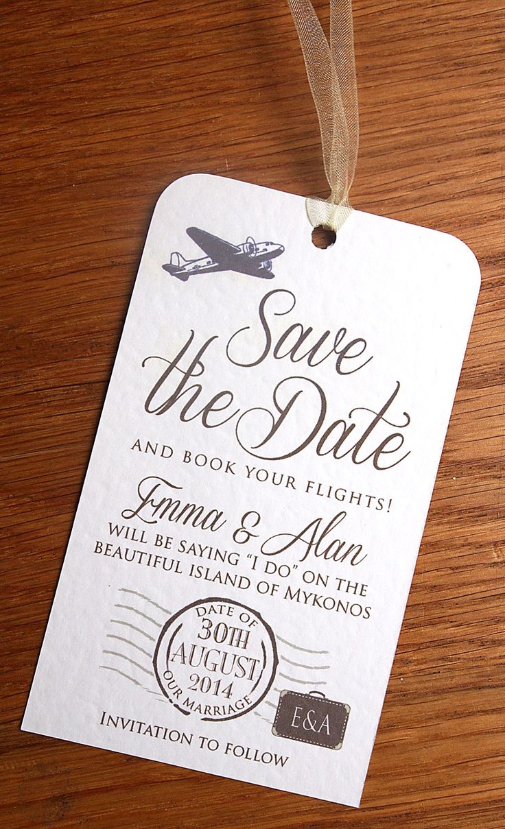Fortunately, destination weddings provide plenty of inspiration for cute and interesting save-the-dates and invitations. Maps, luggage tags, boarding passes, palm trees and even passports are great choices, and can easily be customized.