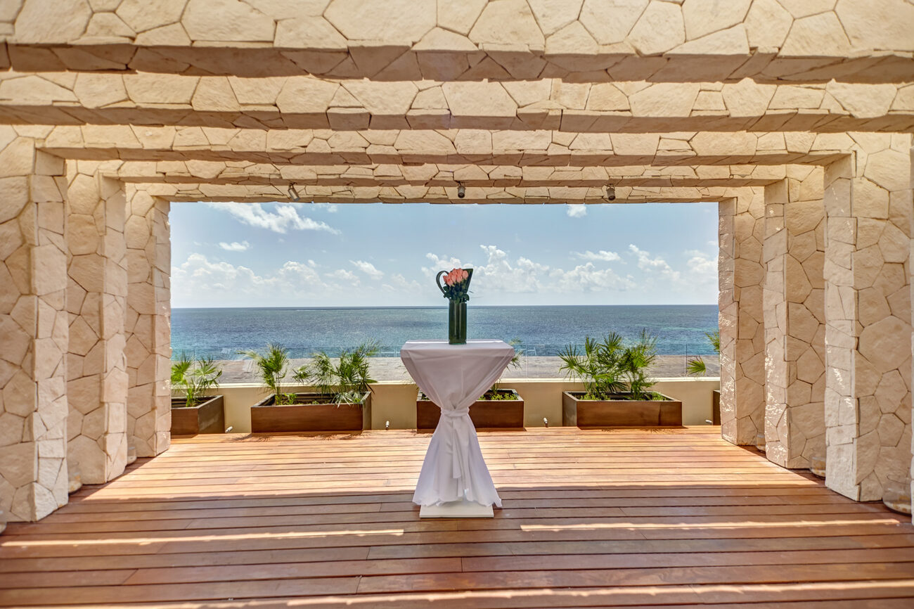 The beach bar is essentially a wooden deck with a partial gazebo on one end, situated right in front of the crystal blues of the ocean. This venue can fit up to 40 guests comfortably for a buffet style dinner, and 70 for a sit down plated dinner. The cool breeze off the water will feel intoxicating in the Riviera Mayan heat once the dancing and celebration are kicked up a notch. Ladies with high heeled shoes will thank you later for the hard wood surface.