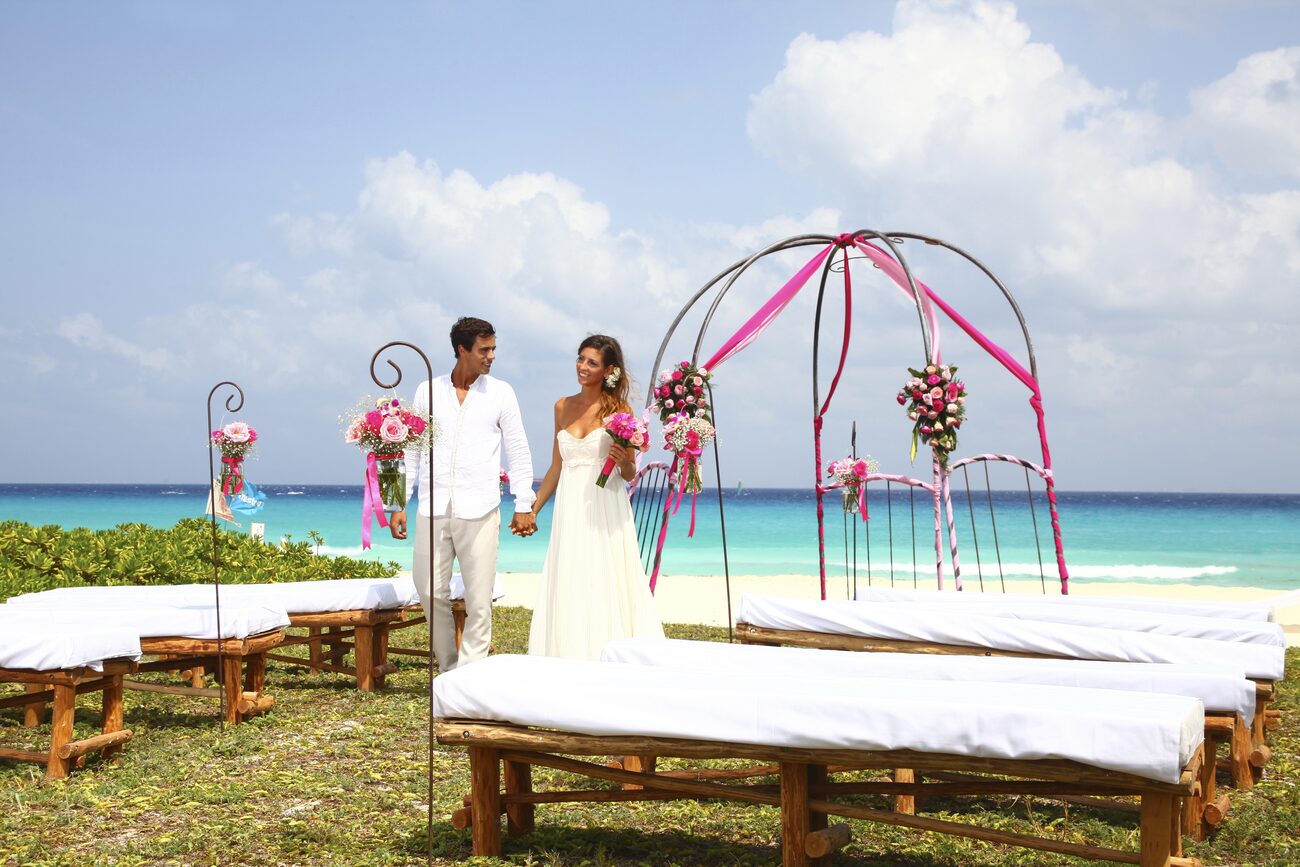 Ocean Front Gazebo at Sandos Playacar. This venue offers the best of both worlds with a gorgeous crystal blue ocean backdrop paired with a hard grassy surface that will allow you to wear your heels!