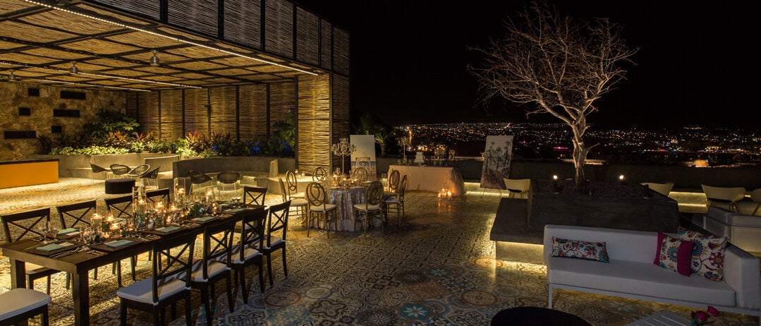 Mountain Top Terrace at Sandos Finisterra. Set high within the resort, this terrace provides weddings with privacy, beautiful natural décor, and an incomparable panoramic view of the city and bay at night time.