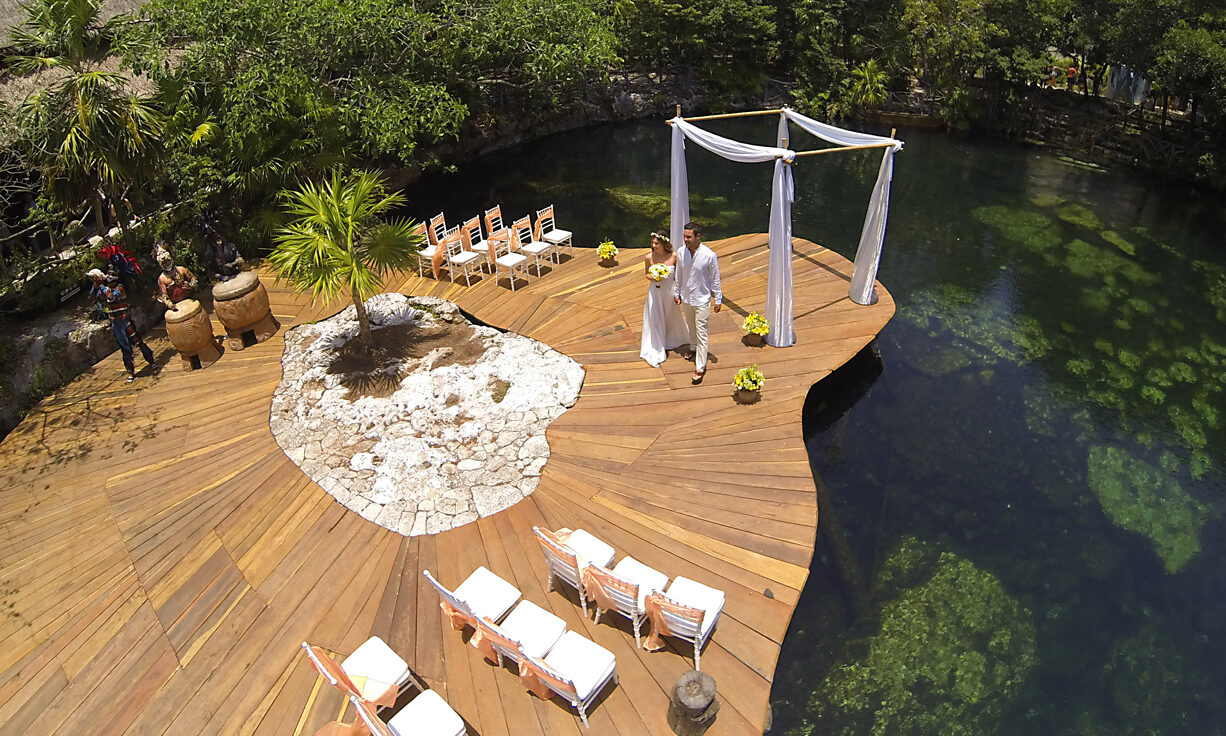Cenote at Sandos Caracol. Perfect for the bride who is looking for a more natural and culturally connected wedding ceremony, the cenote at Sandos Caracol gives just that. Surrounded by natural waters and jungle, couples can be married with a real Mayan drum ceremony to give the ultimate cultural experience! Talk about unforgettable.