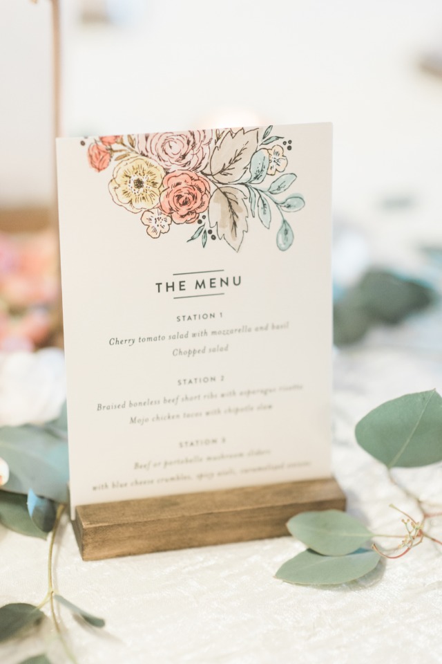 Worried that your wedding reception dinner tables might look a bit bare? Fear not. I suggest adding dinner menus to the tablescape, which will add depth and dimension you can't find in any other decor element at your reception dinner. Most importantly, it gets your guests hyped up for the delicious meal they are about to enjoy.