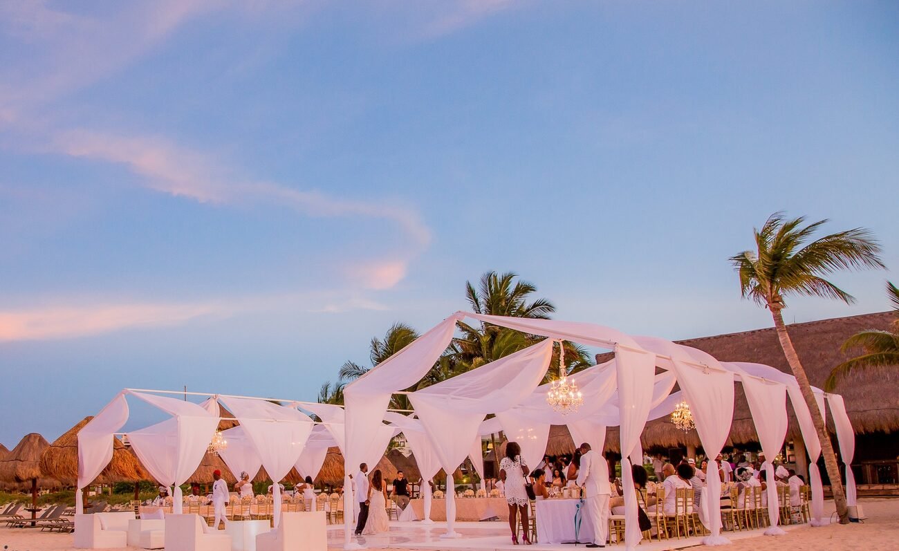 Resorts in Mexico and the Caribbean offer options to upgrade the look of your wedding day chairs with beautiful fabrics. There are 100+ ways to wrap and tie fabric to chairs, and they can add a gorgeous, yet subtle touch to the set up at the ceremony. One thing to consider is the time of year you decide to get married in the tropics, some months are breezier than others and fabric flying in the tropical breeze can be distracting in the final results of your wedding photography.