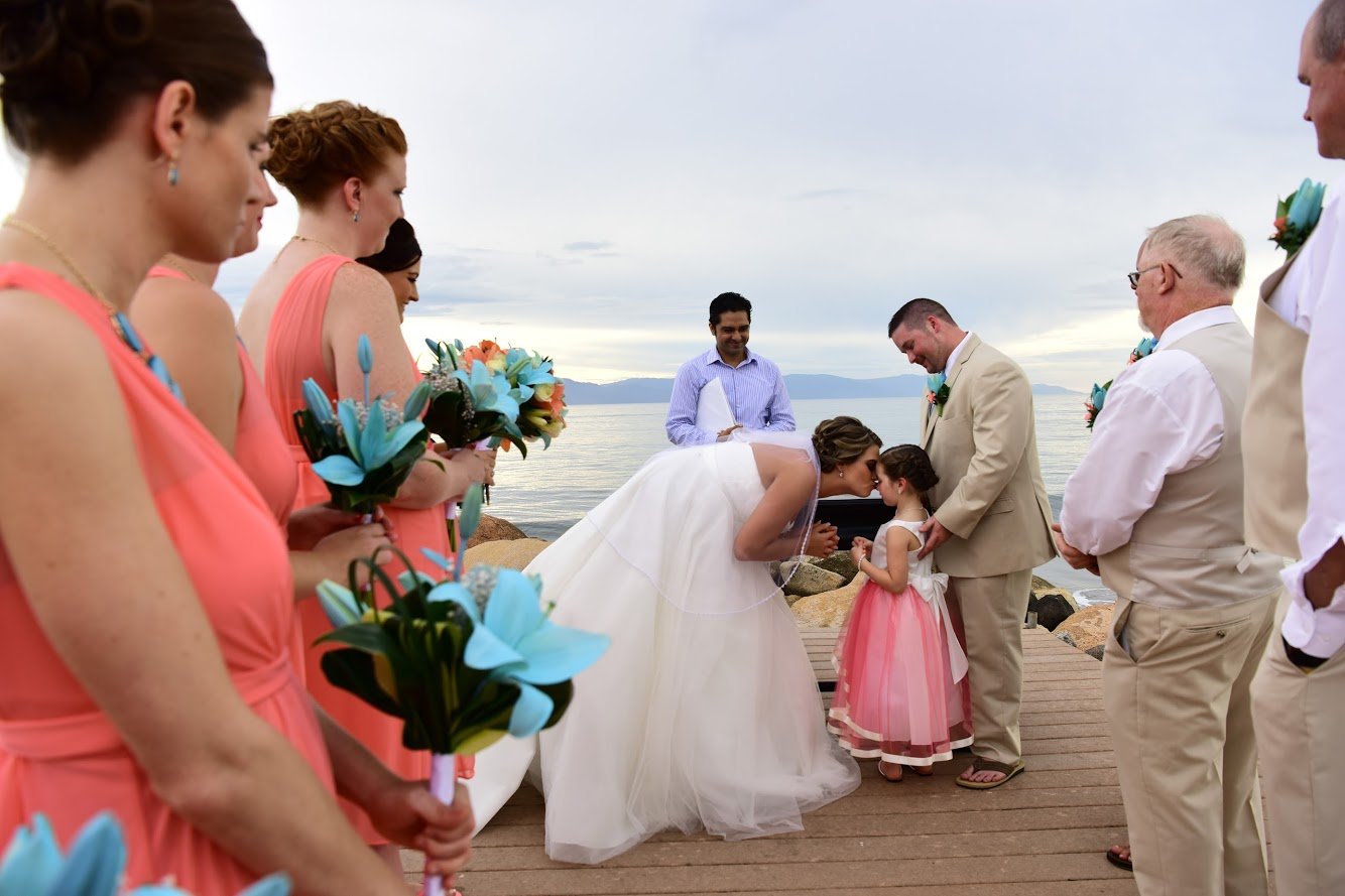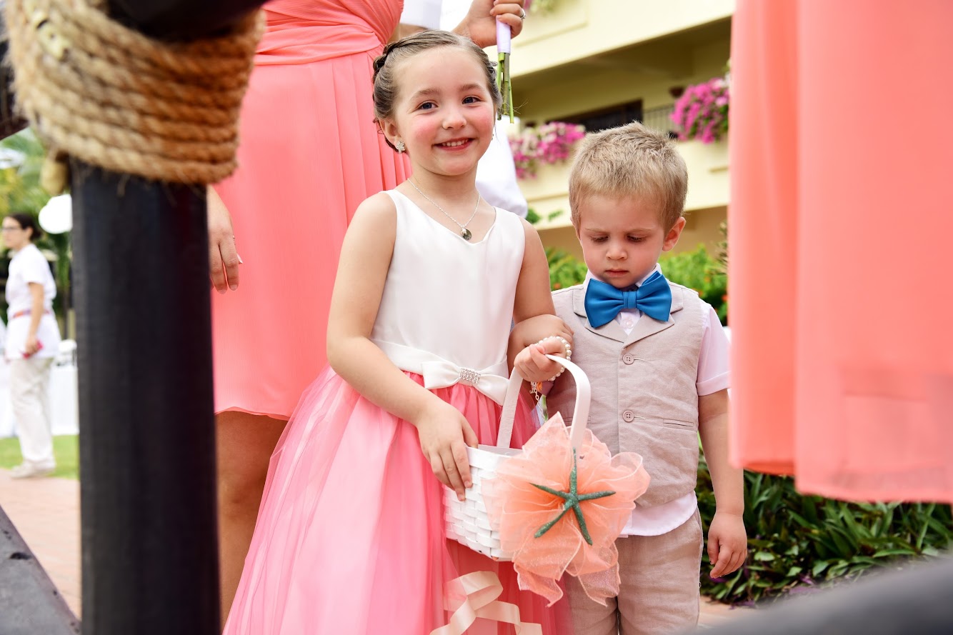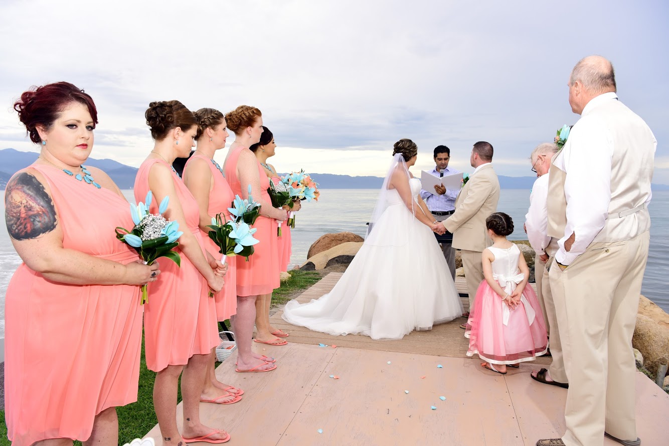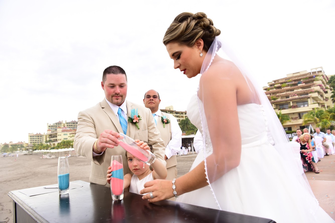 The intimate, oceanfront ceremony took place on the Jetty at Velas Vallarta right before sunset with waves crashing in on the rocks, surrounded by 35 closest friends and family members. There was something about watching a bride and groom that emanate a once in a lifetime kind of love toward one another that gave all in attendance a sense of peace and serenity. The natural beautiful scenery was softly complimented by pops of coral and teal in the sheer chair ribbons and in the bridesmaid and groomsmen attire. Lindsay and Bobby worked directly with the Minister to personalize their ceremony script, adding in a sand ceremony to include their daughter Layla, and poems like The Art of Marriage by author Wilferd A. Peterson for a special romantic touch.